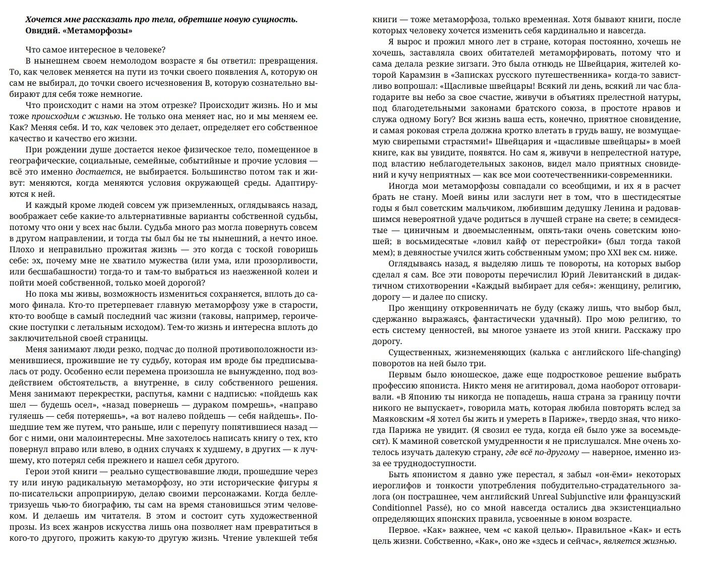 «Эгопроза» – жанр, изобретенный автором для наибольшей естественности повествования. Это соединение эссе, беллетристики и документальной прозы. Тема первой «эгопрозаической» книги – метаморфозы, которые происходят с человеком и в особенности с писателем в определяющие моменты жизни.