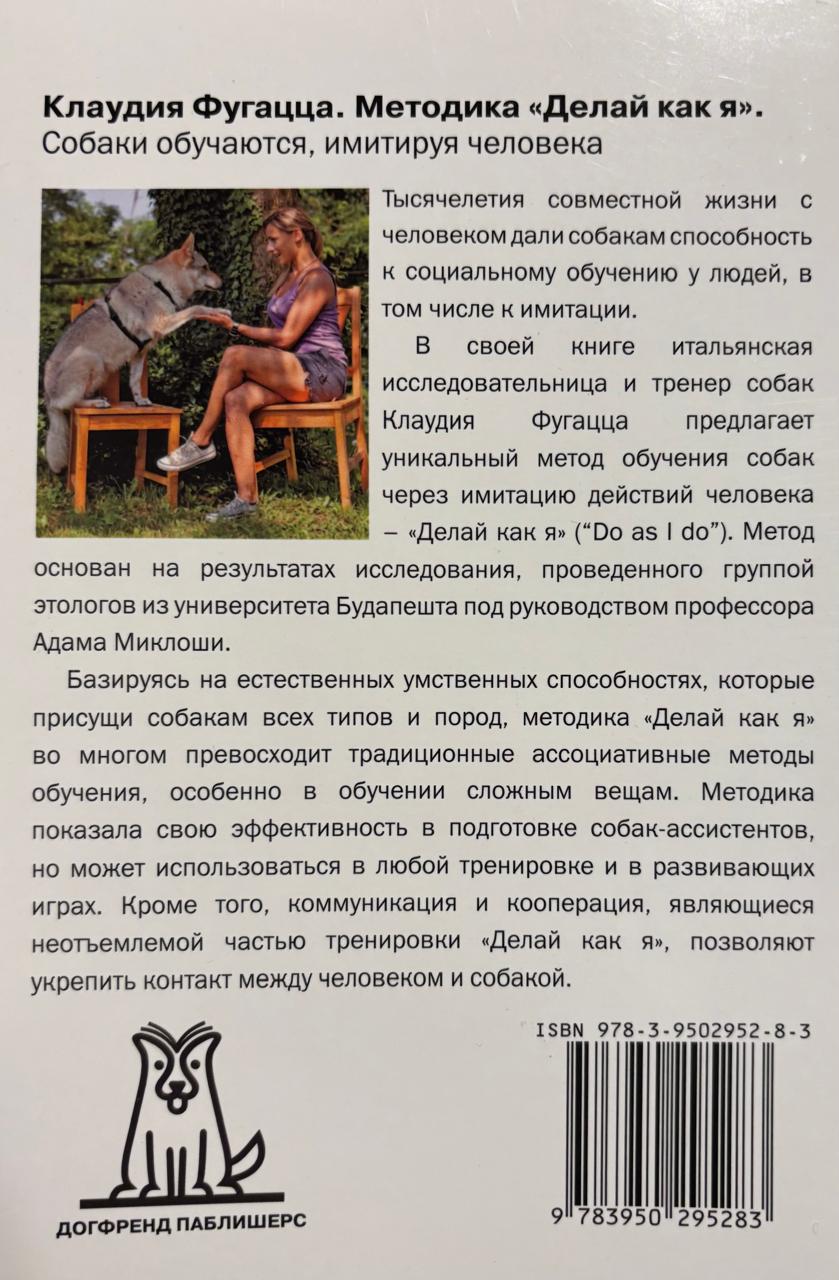 Тысячелетия совместной жизни с человеком дали собакам способность к социальному обучению у людей, в том числе к имитации. В своей книге итальянская исследовательница и тренер собак Клаудия Фугацца предлагает уникальный метод обучения собак через имитацию действий человека — «Делай как я» («Do as I do»). Метод основан на результатах исследования, проведенного группой этологов из университета Будапешта под руководством профессора Адама Миклоши. Базируясь на естественных когнитивных способностях, которые присущи собакам всех типов и пород, методика «Делай как я» во многом превосходит традиционные ассоциативные методы обучения, особенно в обучении сложным вещам. Методика показала свою эффективность в подготовке собак-ассистентов, но может использоваться в любой тренировке и в развивающих играх. Кроме того, коммуникация и кооперация, являющиеся неотъемлемой частью тренировки «Делай как я», позволяют укрепить контакт между человеком и собакой.