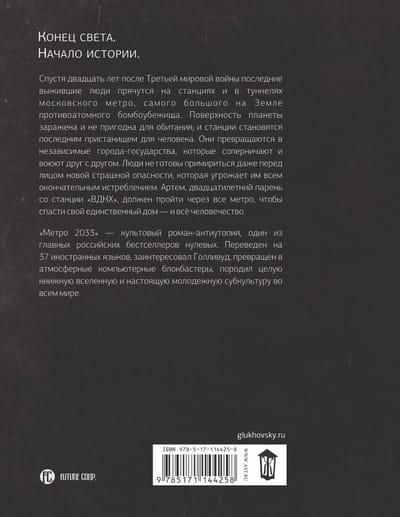 2033 год. Весь мир лежит в руинах. Человечество почти полностью уничтожено. Москва превратилась в город-призрак, отравленный радиацией и населённый чудовищами. Немногие выжившие люди прячутся в московском метро - самом большом противоатомном бомбоубежище на земле. Его станции превратились в города-государства, а в туннелях царит тьма и обитает ужас. Артему, жителю ВДНХ, предстоит пройти через все метро, чтобы спасти от страшной опасности свою станцию, а может быть, и всё человечество. Культовый сетевой роман Дмитрия Глуховского уже известен ста тысячам интернет-пользователей. Выхода этой книги ждали все.