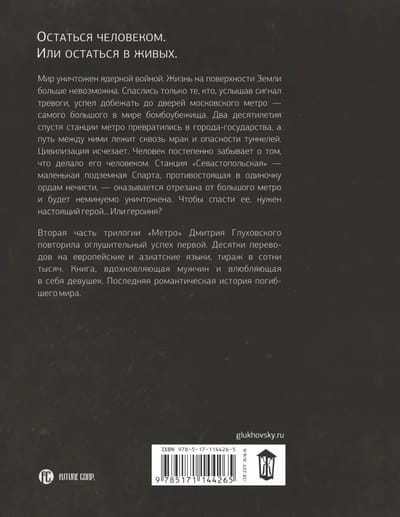 Вторая часть трилогии «Метро» Дмитрия Глуховского повторила оглушительный успех первой. Десятки переводов на европейские и азиатские языки, тираж в сотни тысяч. Книга, вдохновляющая мужчин и влюбляющая в себя девушек. Последняя романтическая история погибшего мира.