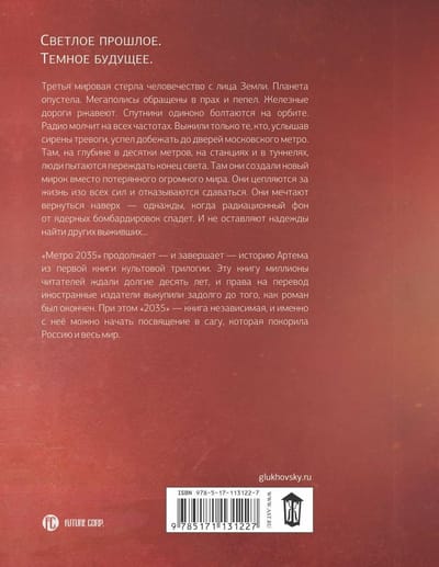 «Метро 2035» продолжает — и завершает историю Артема из первой книги культовой трилогии. Эту книгу миллионы читателей ждали долгие десять лет, и права на перевод иностранные издатели выкупили задолго до того, как роман был окончен. При этом «2035»– книга независимая, и именно с нее можно начать посвящение в сагу, которая покорила множество стран.