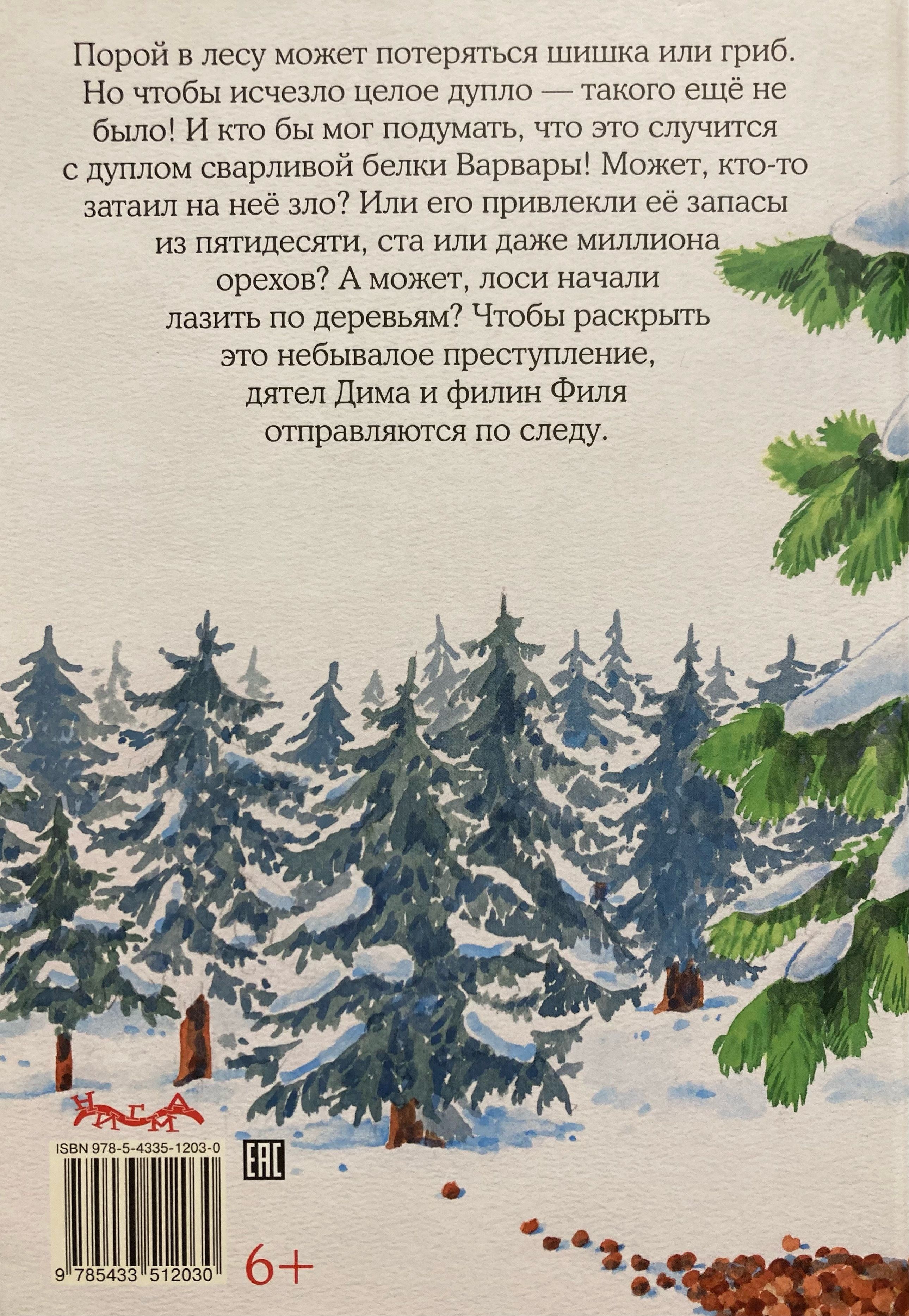 Порой в лесу может потеряться шишка или гриб. Но чтобы исчезло целое дупло — такого ещё не было! И кто бы мог подумать, что это случится с дуплом сварливой белки Варвары! Может, кто-то затаил на неё зло? Или его привлекли её запасы из пятидесяти, ста или даже миллиона орехов? А может, лоси начали лазить по деревьям? Чтобы раскрыть это небывалое преступление, дятел Дима и филин Филя отправляются по следу.