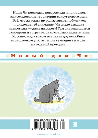 Наша Чи немножко повзрослела и принялась за исследование территории вокруг нового дома. Все, что жужжит, шуршит, гавкает и булькает – привлекает ее внимание. Чи смело выходит на прогулку – даже на дорогу! Там она знакомится с соседями и встречается со старыми приятелями. Хорошо, когда вокруг все такие дружелюбные: кто молочком угостит, кто из западни вызволит, а кто домой проводит...