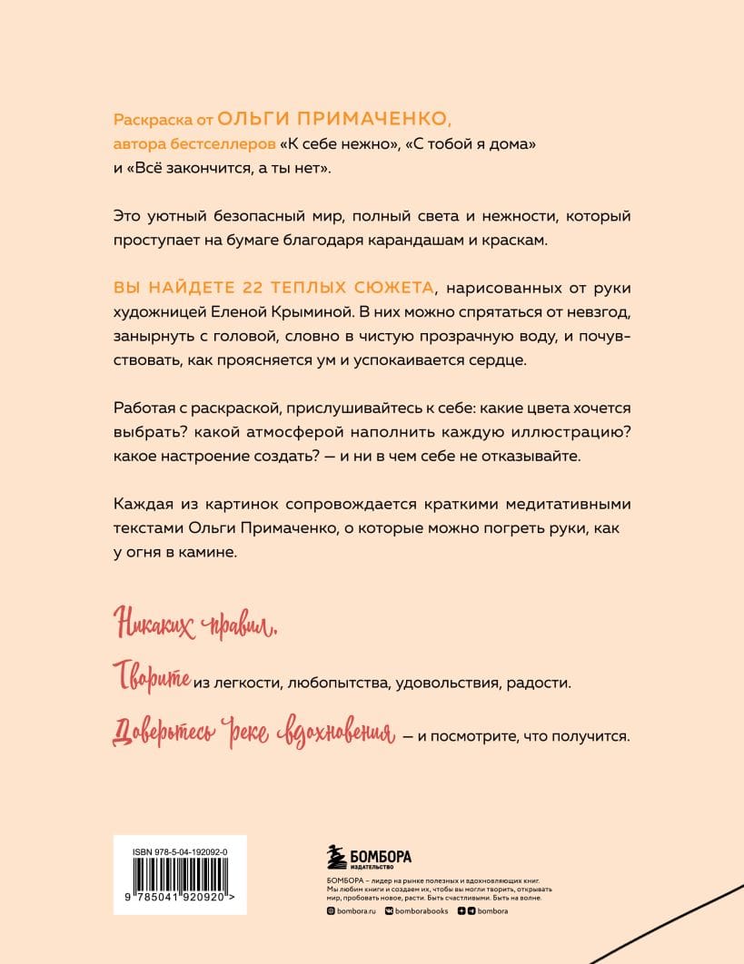 Эта раскраска — уютный безопасный мир, полный света и нежности, который проступает на бумаге благодаря карандашам и краскам. Внутри вы найдете 22 теплых сюжета, нарисованных от руки художницей Еленой Крыминой. В них можно спрятаться от невзгод, занырнуть с головой, словно в чистую прозрачную воду, и почувствовать, как проясняется ум и успокаивается сердце. Работая с раскраской, прислушивайтесь к себе: какие цвета хочется выбрать? какой атмосферой наполнить каждую иллюстрацию? какое настроение создать? — и ни в чем себе не отказывайте. Каждая из картинок сопровождается краткими медитативными текстами Ольги Примаченко, о которые можно погреть руки, как от огня в камине. Никаких правил. Творите из легкости, любопытства, удовольствия, радости. Доверьтесь реке вдохновения — и посмотрите, что получится.