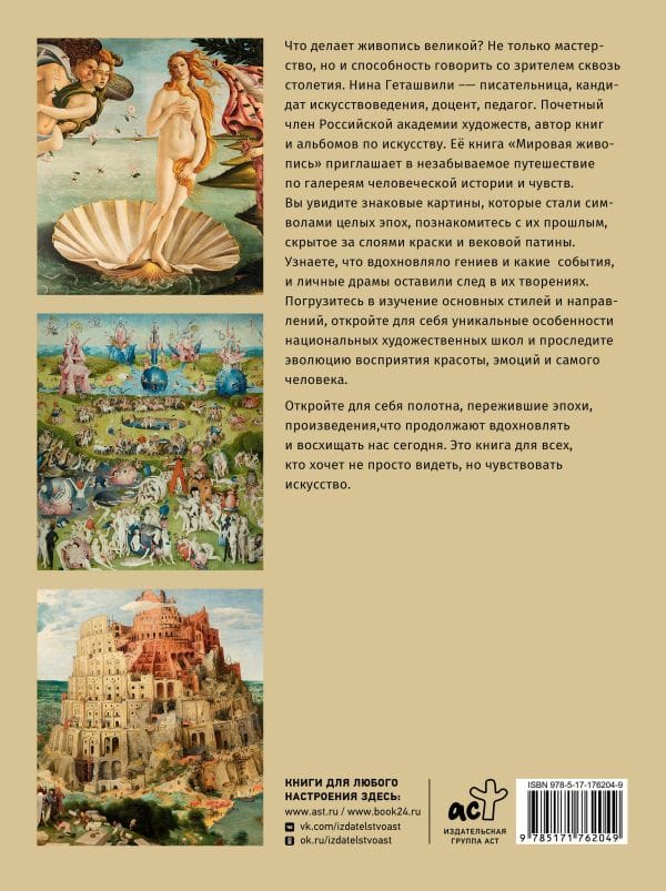 Что делает живопись великой? Не только мастерство, но и способность говорить со зрителем сквозь столетия. Нина Геташвили — писательница, кандидат искусствоведения, доцент, педагог. Почетный член Российской академии художеств, автор книг и альбомов по искусству. Её книга «Мировая живопись» приглашает в незабываемое путешествие по галереям человеческой истории и чувств.