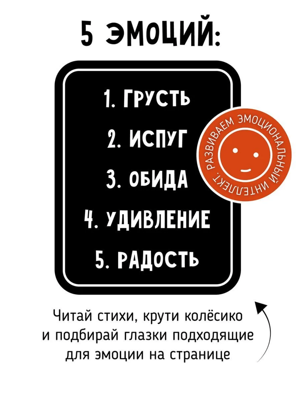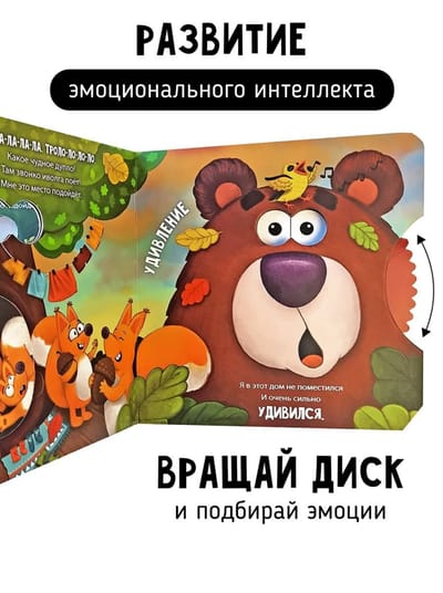 Каждая страница — это новое приключение! Вместе с главными героями книги ваш ребенок открывает секретные створки, попадает в неожиданные ситуации и знакомится с разнообразием эмоций. Радость, грусть, испуг или удивление — крутя интерактивное колесико, малыш сможет подобрать, что именно испытывают герои в данный момент!