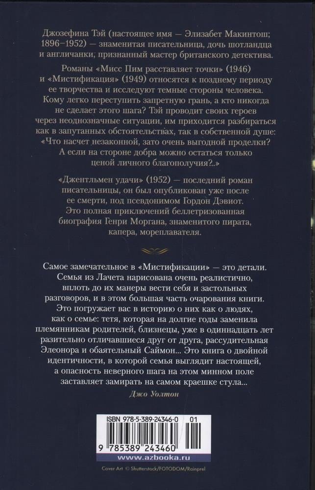 Джозефина Тэй (наст. имя — Элизабет Макинтош; 1896–1952) — знаменитая писательница, дочь шотландца и англичанки, признанный мастер британского детектива. Романы «Мисс Пим расставляет точки» (1946) и «Мистификация» (1949) относятся к позднему периоду ее творчества и исследуют темные стороны человека. Кому легко переступить запретную грань, а кто никогда не сделает этого шага? Тэй проводит своих героев через неоднозначные ситуации, им приходится разбираться как в запутанных обстоятельствах, так в собственной душе: «Что насчет незаконной, зато очень выгодной проделки? А если на стороне добра можно остаться только ценой личного благополучия?..» «Джентльмен удачи» (1952) — последний роман писательницы, он был опубликован уже после ее смерти, под псевдонимом Гордон Дэвиот. Это полная приключений беллетризованная биография Генри Моргана, знаменитого пирата, капера, мореплавателя.