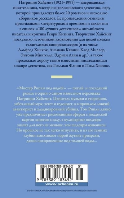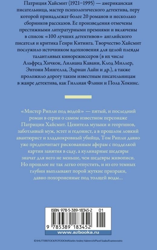 «Мистер Рипли под водой» — пятый, и последний роман в серии о самом известном персонаже Патриции Хайсмит, американской писательницы, признанном мастере психологического детектива. Ценитель музыки и цветов, заботливый муж, эстет и гедонист, а в прошлом ловкий авантюрист и хладнокровный убийца, Том Рипли давно уже предпочитает рискованным аферам с подделкой картин занятия в саду, а кулинарные шедевры значат для него не меньше, чем шедевры живописи. Но прошлое не так легко отпустить, и из его темных глубин выплывают порой жуткие призраки, давно похороненные под толщей воды…