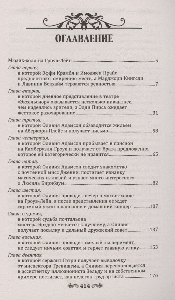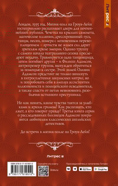 Однако труппу с самого начала театрального сезона преследуют неудачи. Травмируется одна танцовщица, затем погибает другая – и Филипп Адамсон, антрепренер труппы, вынужден обратиться за помощью к сестре. Этой зимой Оливии Адамсон предстоит не только вникнуть в хитросплетения закулисных интриг, но и попробовать себя в амплуа ассистентки иллюзиониста и полицейского осведомителя, а также спасти от петли невиновного, разоблачив истинного преступника. Но как понять, какие чувства таятся за улыбками и ярким гримом? Как распознать, кто лжет, а кто говорит правду? Третья книга серии о расследованиях близнецов Адамсон понравится любителям классических английских детективов. До встречи в мюзик-холле на Гроув-Лейн.
