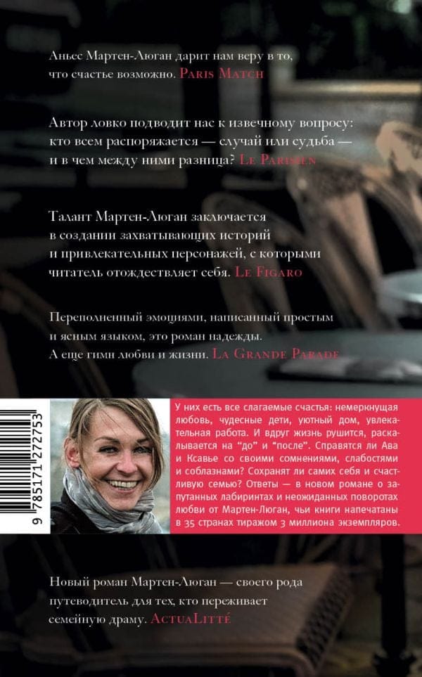 Жизнь галеристки Авы — словно картинка из глянцевого журнала: красивый дом, обожаемый муж Ксавье, дочка и сын — радость мамы и папы, любимое дело. Но однажды в полную любви и счастья семейную жизнь вмешивается судьба, и все рушится. В благополучном доме Авы и Ксавье поселяются горе и сомнения друг в друге, а стойкость и сила духа героев романа подвергаются серьезному испытанию. Впереди у них долгий путь через соблазны и страхи к новому пониманию самих себя. Им предстоит разбираться не только в своих отношениях, но и во взаимоотношениях с другими людьми, с которыми их связывает случай. В этой книге молодая француженка Аньес Мартен-Люган, автор бестселлера «Счастливые люди читают книжки и пьют кофе» и других пронзительных историй любви, завоевавших успех во всем мире, всматривается в новые грани этого вечного чувства.