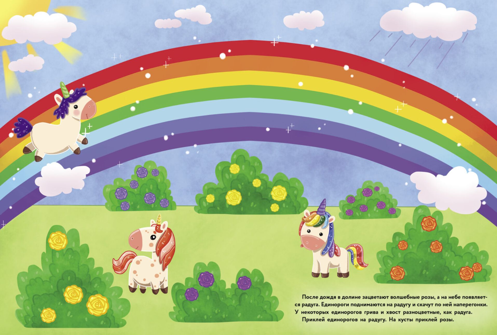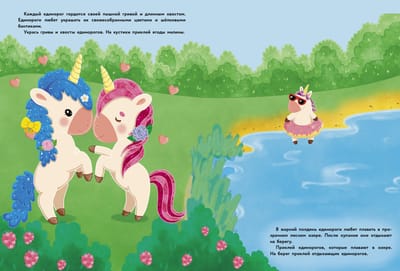 Давай отправимся в волшебную долину и познакомимся с единорогами. Они покажут тебе зелёные луга, радугу, высокие горы и шумящие водопады. А многоразовые наклейки сделают путешествие незабываемым!