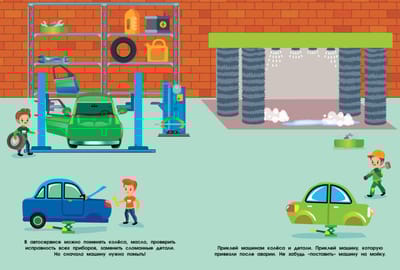 Вместе с героями книжки ты сможешь побывать в автосервисе, на заправке, на парковке и в гараже. Играй, придумывай свои истории и приклеивай машинки. С многоразовыми наклейками будет вдвойне интересно! Для детей до трех лет.