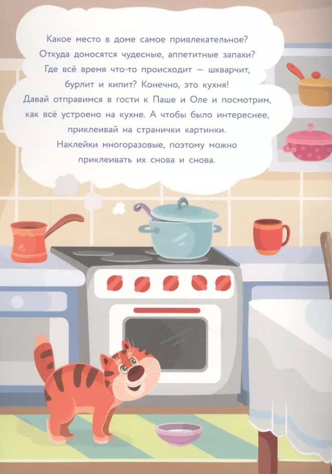 Приглашаем тебя в гости на нашу кухню. Сколько тут интересного! Разная посуда, бытовая техника, кухонная утварь - можно всё расклеить на полочки, приготовить обед, накрыть на стол и наполнить холодильник продуктами. А с многоразовыми наклейками делать это вдвойне интереснее! Для детей до 3 лет.