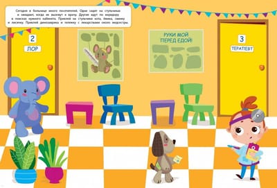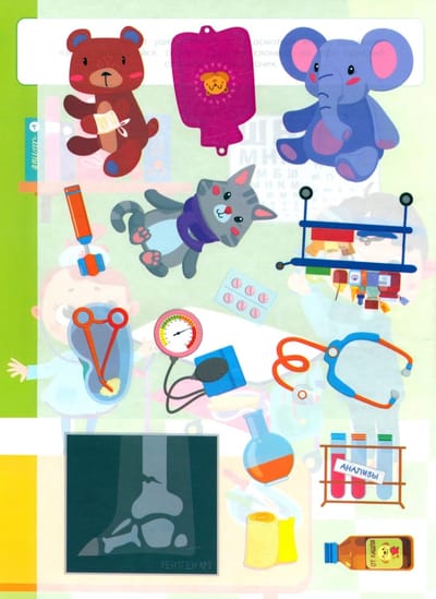 С этой книжкой ваш малыш сможет стать самым настоящим врачом! Игрушки уже выстроились в очередь. Им нужно сделать прививку, наложить гипс, проверить ушки, исследовать анализы, выписать рецепт. Приклеивайте картинки и придумывайте свои истории с игрушками. Наклейки в книжке многоразовые, поэтому можно приклеивать их снова и снова! А самое главное - не бойтесь врачей и не болейте!