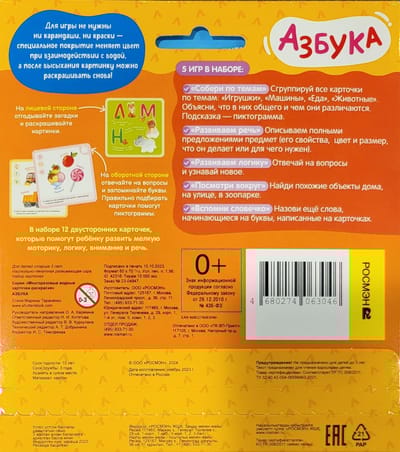 Раскрашиваем и развиваемся. Самый большой набор из 12 многоразовых двусторонних карточек с играми и развивающими заданиями. В серии только популярные темы для малышей. С одной стороны карточки авторские стихи-загадки Марины Тараненко, а с оборотной – 5 игр и развивающих заданий на внимание и мышление. Специальное покрытие обеспечит долговечность использования, а рисунок высохнет всего за 5 минут, и можно будет раскрашивать снова. Карточки оптимального размера, которые идеально подходят для детской руки, а набор удобно взять с собой в дорогу.