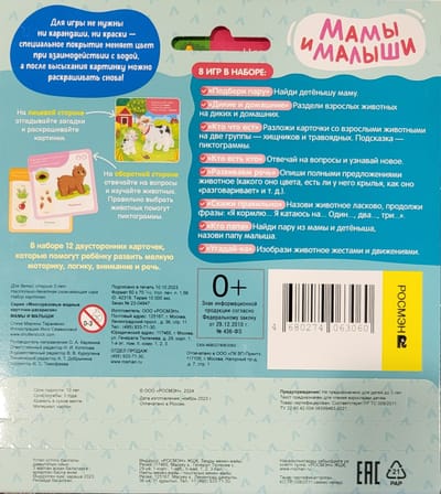 Раскрашиваем и развиваемся. Самый большой набор из 12 многоразовых двусторонних карточек с играми и развивающими заданиями. В серии только популярные темы для малышей. С одной стороны карточки авторские стихи-загадки Марины Тараненко, а с оборотной – 5 игр и развивающих заданий на внимание и мышление. Специальное покрытие обеспечит долговечность использования, а рисунок высохнет всего за 5 минут, и можно будет раскрашивать снова. Карточки оптимального размера, которые идеально подходят для детской руки, а набор удобно взять с собой в дорогу.