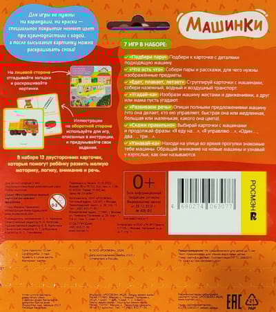 Раскрашиваем и развиваемся. Самый большой набор из 12 многоразовых двусторонних карточек с играми и развивающими заданиями. В серии только популярные темы для малышей. С одной стороны карточки авторские стихи-загадки Марины Тараненко, а с оборотной – 7 игр и развивающих заданий на внимание и мышление. Специальное покрытие обеспечит долговечность использования, а рисунок высохнет всего за 5 минут, и можно будет раскрашивать снова. Карточки оптимального размера, которые идеально подходят для детской руки, а набор удобно взять с собой в дорогу.