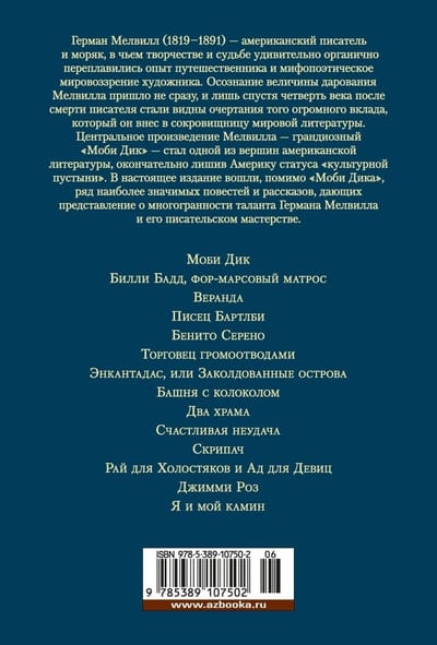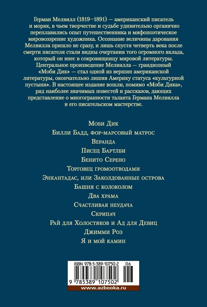 Герман Мелвилл (1819-1891) – американский писатель и моряк, в чьем творчестве и судьбе удивительно органично переплавились опыт путешественника и мифопоэтическое мировоззрение художника. Осознание величины дарования Мелвилла пришло не сразу, и лишь спустя четверть века после смерти писателя стали видны очертания того огромного вклада, который он внес в сокровищницу мировой литературы. Центральное произведение Мелвилла – грандиозный «Моби Дик» – стал одной вершин американской литературы, окончательно лишив Америку статуса «культурной пустыни». В настоящее издание вошли, помимо «Моби Дика», ряд наиболее значимых повестей и рассказов, дающих представление о многогранности таланта Германа Мелвилла и его писательском мастерстве.