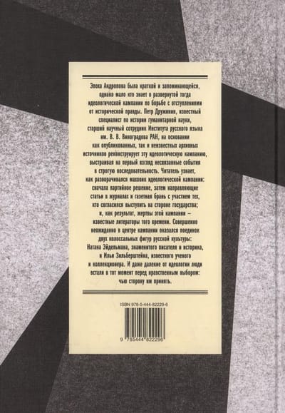 Эпоха Андропова была краткой и запоминающейся, однако мало кто знает о развернутой тогда идеологической кампании по борьбе с отступлениями от исторической правды. Петр Дружинин, известный специалист по истории гуманитарной науки, старший научный сотрудник Института русского языка им. В. В. Виноградова РАН, на основании как опубликованных, так и неизвестных архивных источников реконструирует эту идеологическую кампанию, выстраивая на первый взгляд несвязанные события в строгую последовательность. Читатель узнает, как разворачивался маховик идеологической кампании: сначала партийное решение, затем направляющие статьи в журналах и газетная брань с участием тех, кто согласился выступить на стороне государства; и, как результат, жертвы этой кампании - известные литераторы того времени. Совершенно неожиданно в центре кампании оказался поединок двух колоссальных фигур русской культуры: Натана Эйдельмана, знаменитого писателя и историка, и Ильи Зильберштейна, известного ученого и коллекционера. И даже далекие от идеологии люди встали в тот момент перед нравственным выбором: чью сторону им принять.