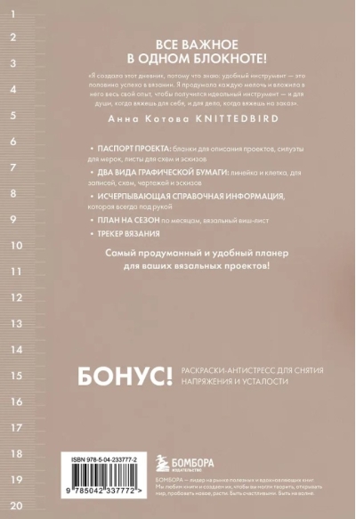 Ваш идеальный спутник в мире вязания! Этот специально созданный планер станет надежным хранителем всех ваших творческих замыслов. Здесь найдется место для всего: от таблиц для шапок и шарфов до учета пряжи и любимых мастер-классов.