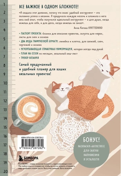 Идеальный планер для тех кто вяжет для себя и на заказ! Все в одном месте: страницы для описания проектов, схемы для расчетов петель, таблицы для снятия мерок, график работы, трекер и даже раскраски антистресс. Забудьте о клочках бумаги и никогда не теряйте ход мысли.