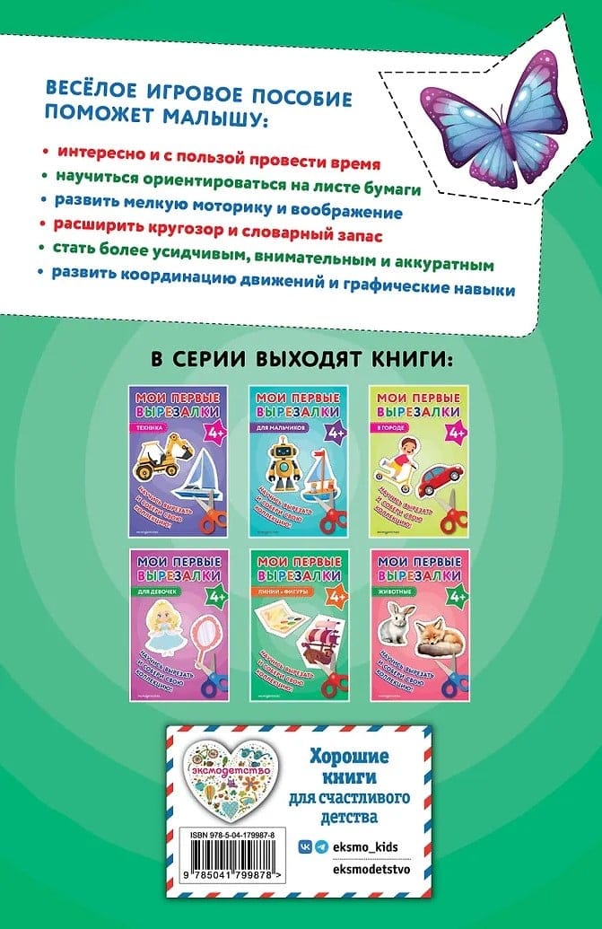 Удобный формат, плотная бумага, которая не рвется при вырезании, и крупные и яркие картинки для вырезания делают работу с книгой максимально комфортной и интересной. Пунктирные линии подскажут, где именно нужно резать, и помогут ребенку почувствовать уверенность.