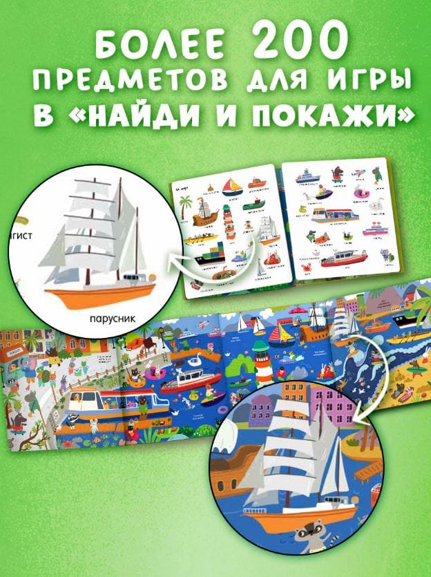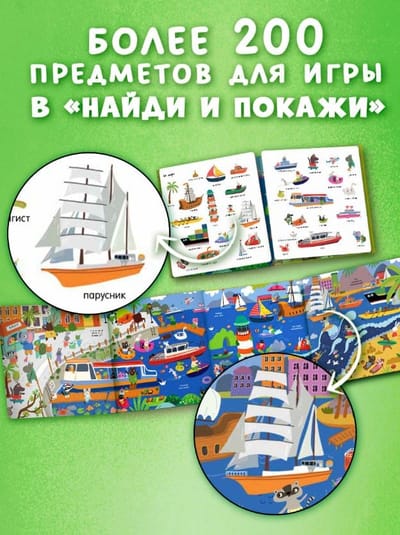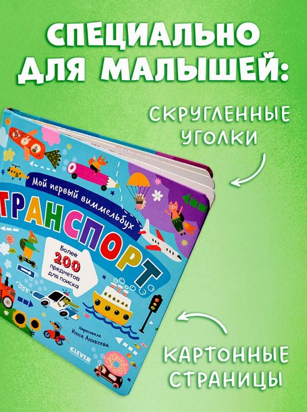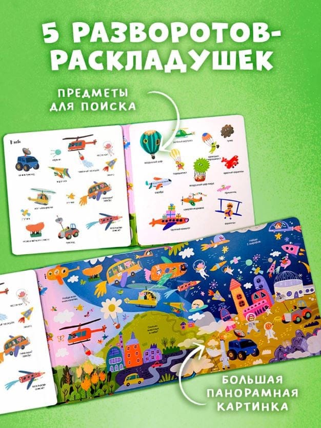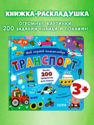 Красочный виммельбух для малышей приглашает вас в мир транспорта на земле и в воде, в полях и небе, даже в космосе. Исследуйте, ищите предметы, выполняйте задания книги для детей и соревнуйтесь!