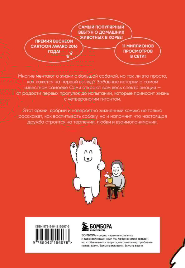 Легендарный корейский вебтун, собравший 11 миллионов просмотров и удостоенный премии Bucheon Cartoon Award, теперь в печатном формате! В нем — забавные и трогательные истории о самом известном самоеде Соми, которые покажут всю правду жизни с большой собакой: от радости первых прогулок до смешных, а порой и непростых испытаний. Этот яркий, добрый и невероятно жизненный комикс не только расскажет, как воспитывать собаку, но и напомнит, что настоящая дружба строится на терпении, любви и взаимопонимании.
