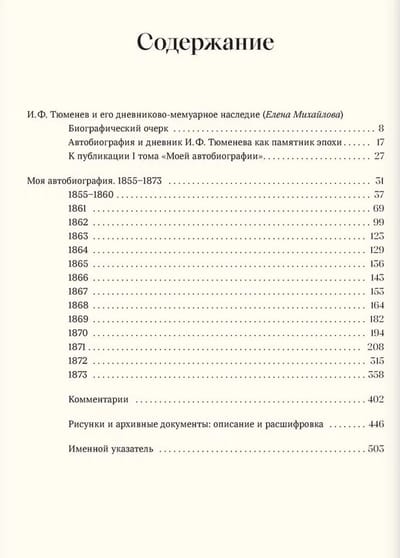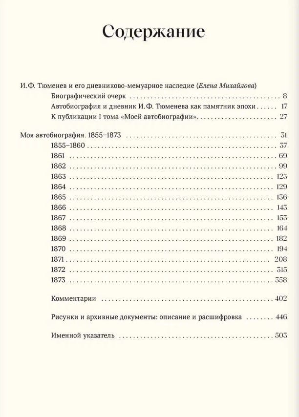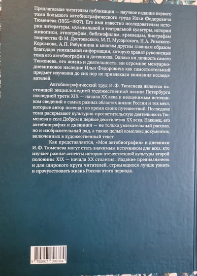 Настоящее издание открывает публикацию большого автобиографического труда литератора, публициста, музыканта, художника, переводчика, коллекционера И. Ф. Тюменева (1855–1927). Первый том «Моей автобиографии» содержит информацию о роде Тюменевых, рыбинских купцах; о детских и юношеских годах автора, людях, которые его окружали; об учебе в гимназии Г. Видемана; театральных впечатлениях и увлечении балериной Мариинского театра; о поездках на Валаам и первых заграничных путешествиях, во время которых он посетил Италию, Германию, Швейцарию, Голландию, Англию, Францию. И. Ф. Тюменев доводит повествование до конца 1873 года. Особенностью памятника является включение в художественное поле автобиографии значительного количества приклеенных к листам рисунков и документов. Все эти листы представлены в издании цифровыми копиями. В специальном разделе приведены описания рисунков, дана расшифровка писем и рукописных частей текстовых документов.