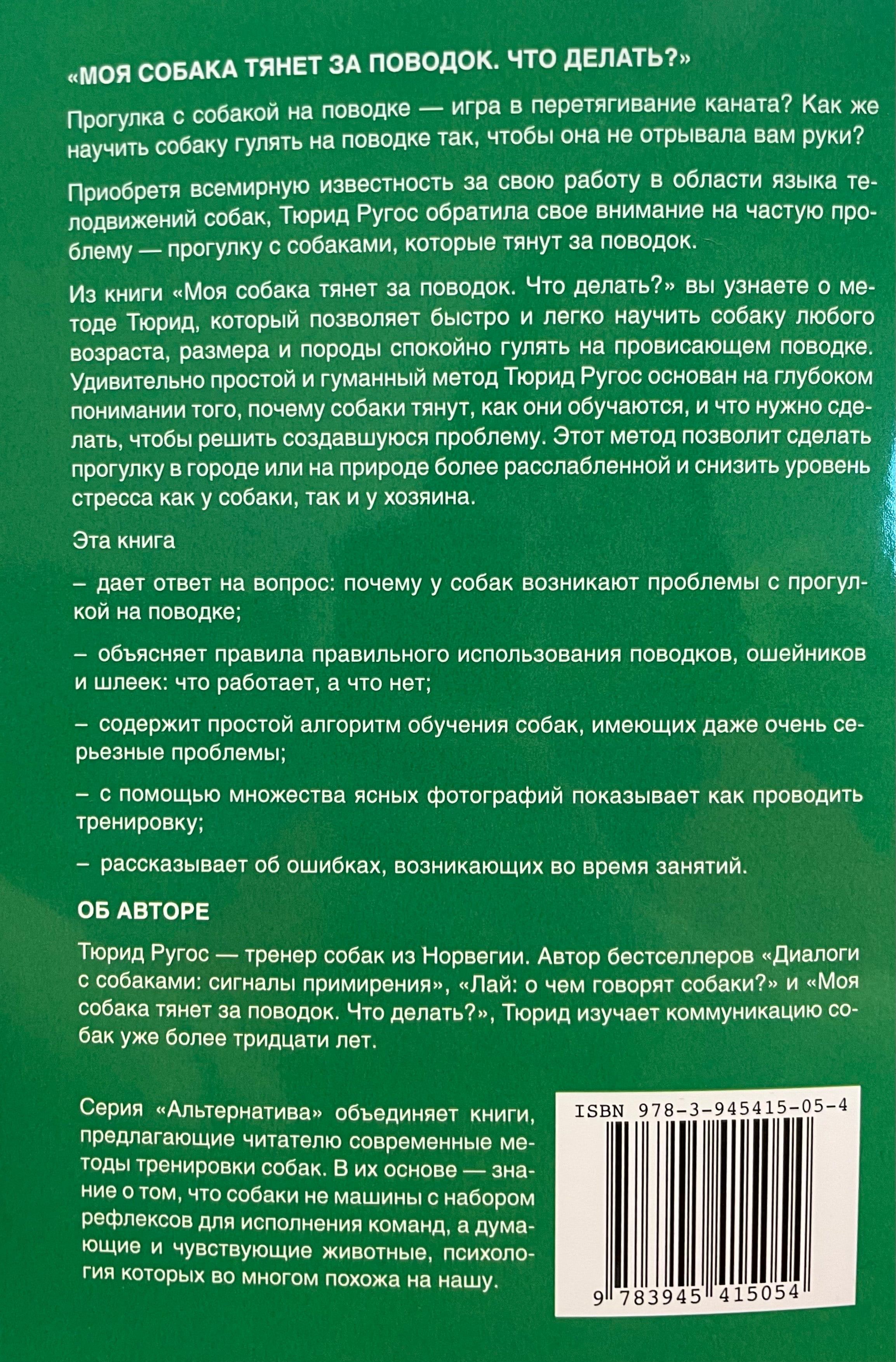 Прогулка с собакой на поводке - игра в перетягивание каната? Как же научить собаку гулять на поводке так, чтобы она не отрывала вам руки? Приобретя всемирную известность за свою работу в области языка телодвижений собак, Тюрид Ругос обратила свое внимание на частую проблему - прогулку с собаками, которые тянут за поводок. Из книги Моя собака тянет за поводок. Что делать? вы узнаете о методе Тюрид, который позволяет быстро и легко научить собаку любого возраста, размера и породы спокойно гулять на провисающем поводке. Удивительно простой и гуманный метод Тюрид Ругос основан на глубоком понимании того, почему собаки тянут, как они обучаются, и что нужно сделать, чтобы решить создавшуюся проблему. Этот метод позволит сделать прогулку в городе или на природе более расслабленной и снизить уровень стресса как у собаки, так и у хозяина.