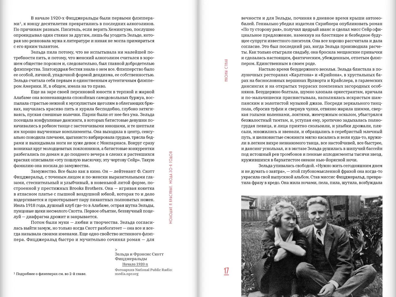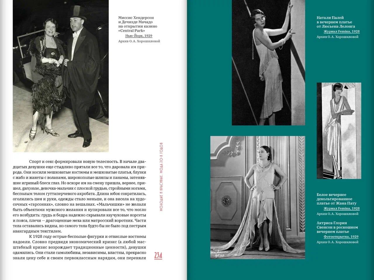 В своей книге Ольга Хорошилова представляет эту красивую и безумную эпоху сквозь призму моды. Автор пишет об иконах стиля и главных кутюрье того времени, о том, как Первая мировая война сформировала стиль garçonne, а косметологи — стиль flapper. Спорт, джаз, клубы, гангстеры, Уолл-стрит, свободная любовь, травести, африканские пляски, ар-деко, авангард и даже археология — все самые важные явления культуры тех лет описаны в контексте их влияния на моду.