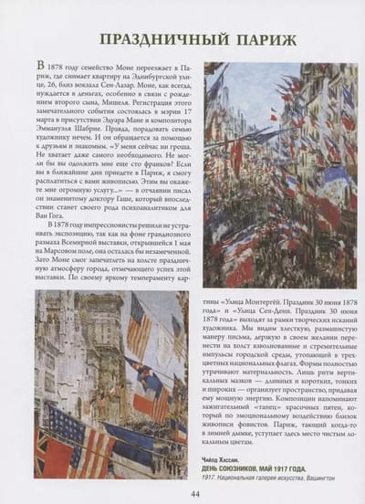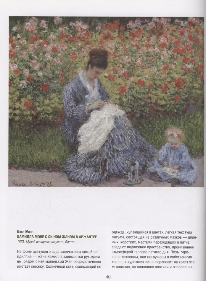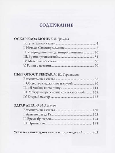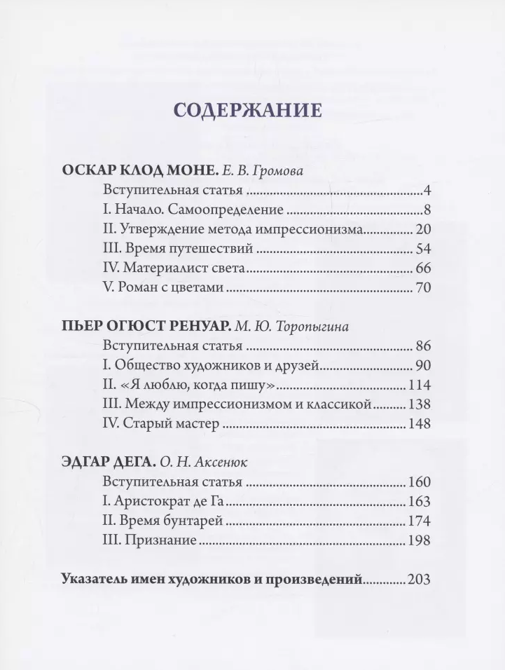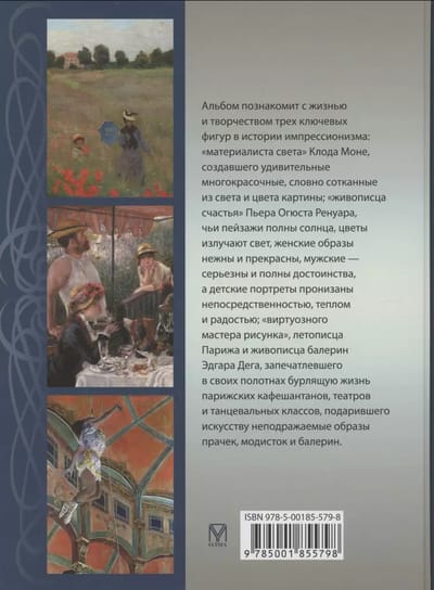 Альбом познакомит с жизнью и творчеством трех ключевых фигур в истории импрессионизма: «материалиста света» Клода Моне, создавшего удивительные многокрасочные, словно сотканные из света и цвета картины; «живописца счастья» Пьера Огюста Ренуара, чьи пейзажи полны солнца, цветы излучают свет, женские образы нежны и прекрасны, мужские — серьезны и полны достоинства, а детские портреты пронизаны непосредственностью, теплом и радостью; «виртуозного мастера рисунка», летописца Парижа и живописца балерин Эдгара Дега, запечатлевшего в своих полотнах бурлящую жизнь парижских кафешантанов, театров и танцевальных классов, подарившего искусству неподражаемые образы прачек, модисток и балерин.
