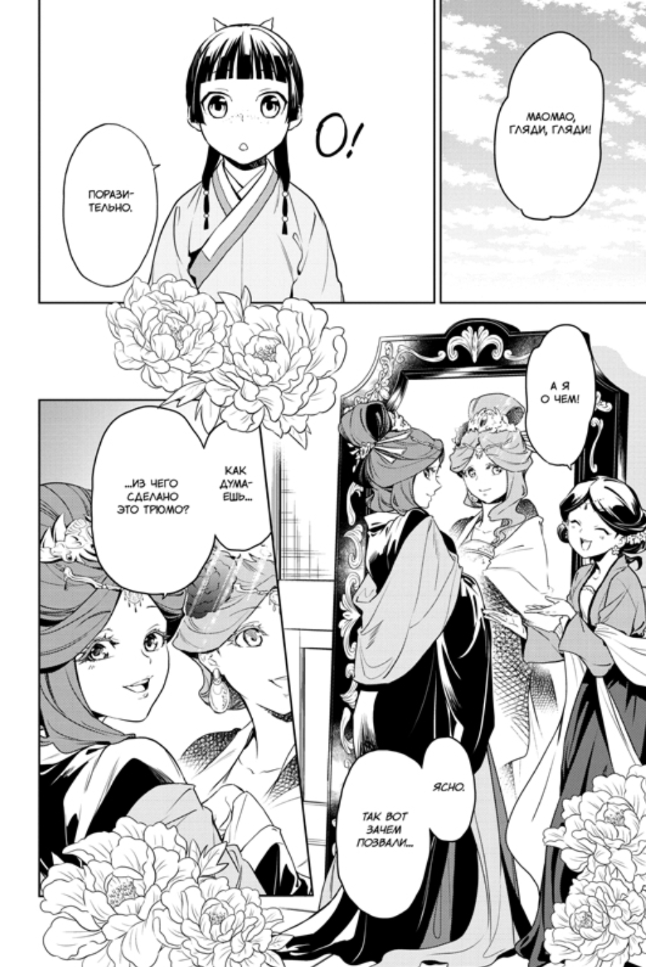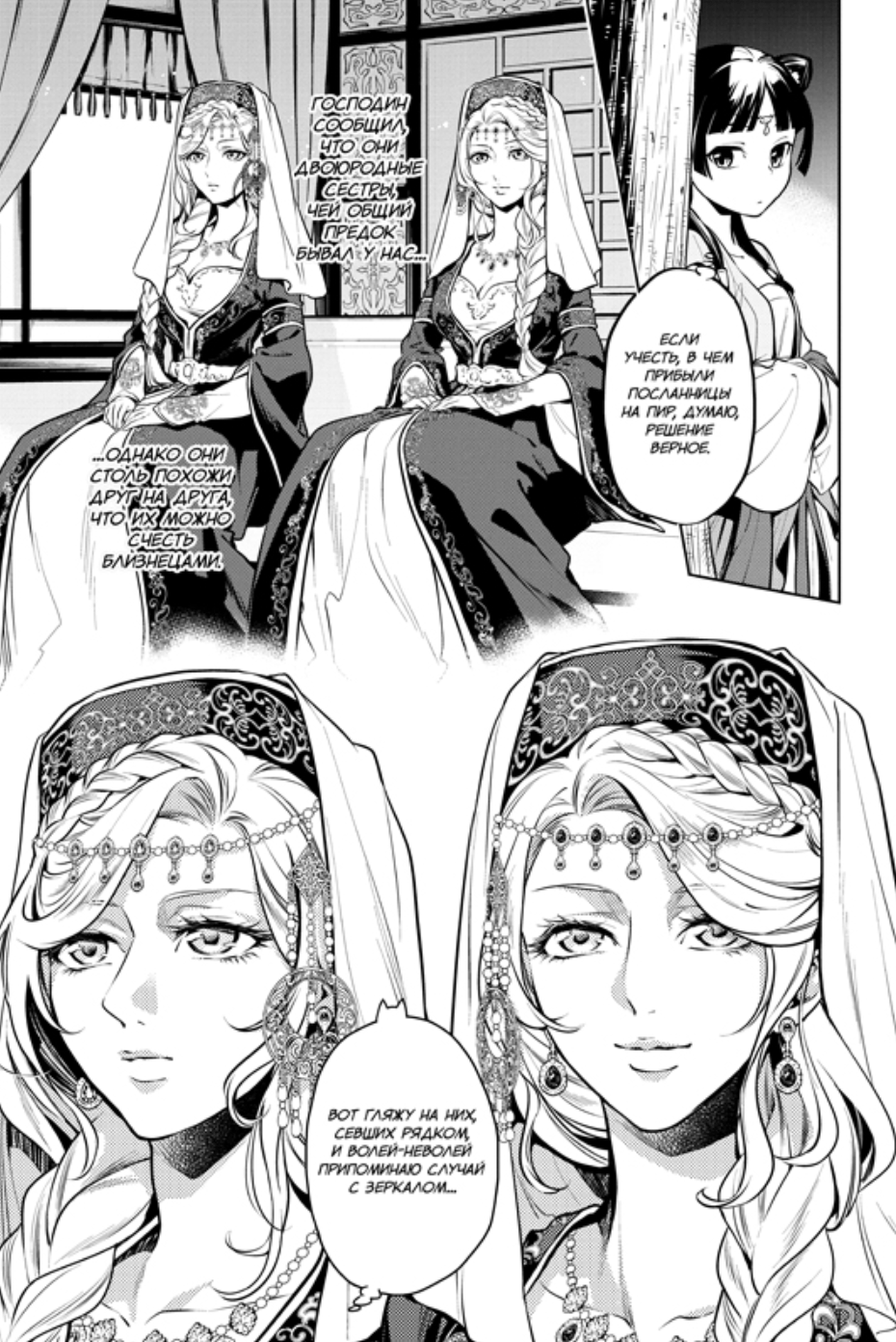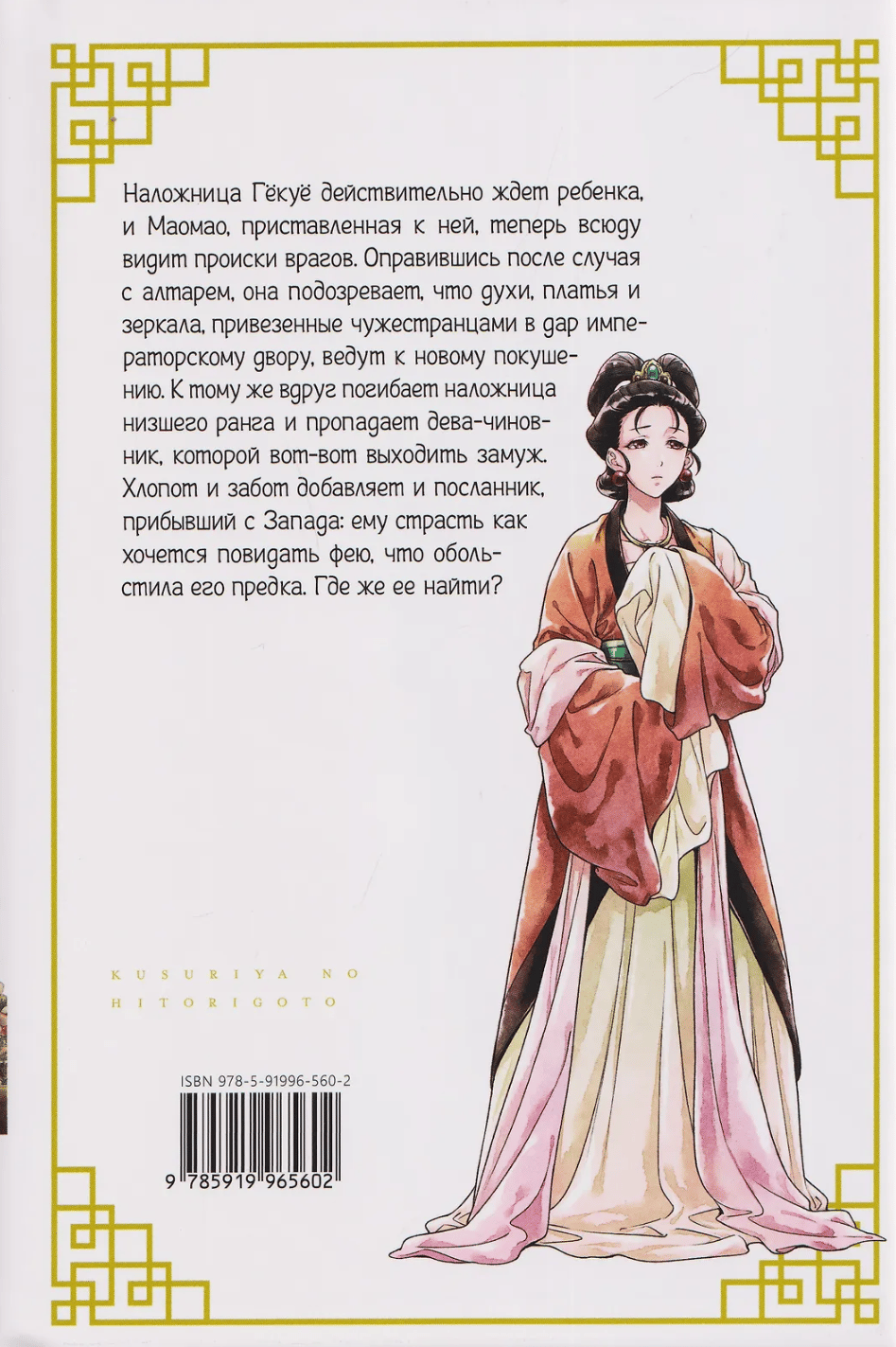 Наложница Гёкуё действительно ждет ребенка, и Маомао, приставленная к ней, теперь всюду видит происки врагов. Оправившись после случая с алтарем, она подозревает, что духи, платья и зеркала, привезенные чужестранцами в дар императорскому двору, ведут к новому покушению. К тому же вдруг погибает наложница низшего ранга и пропадает дева-чиновник, которой вот-вот выходить замуж. Хлопот и забот добавляет и посланник, прибывший с Запада: ему страсть как хочется повидать фею, что обольстила его предка. Где же ее найти?