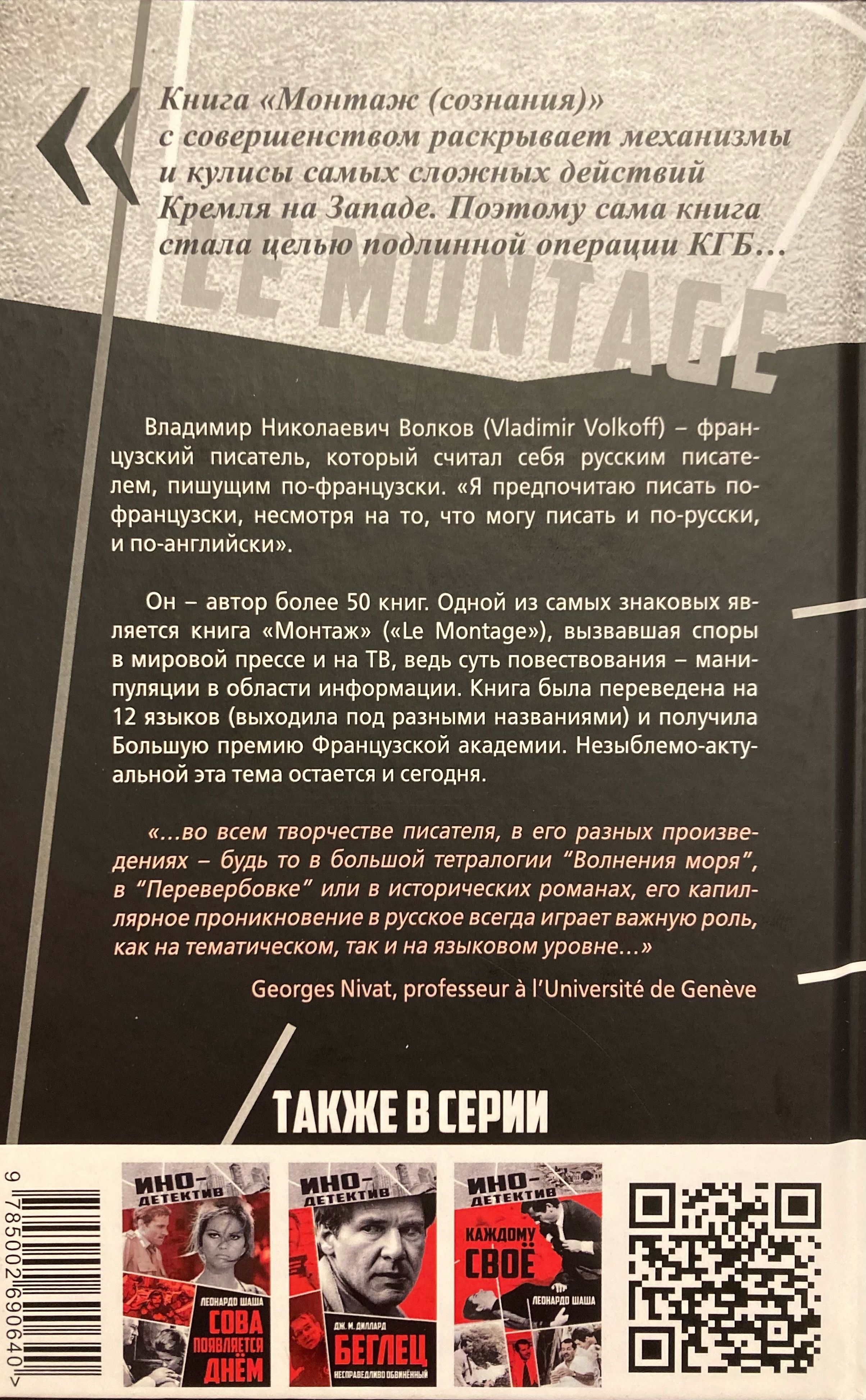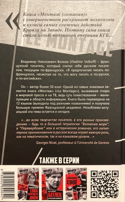 Одной из самых знаковых является книга «Монтаж» («Le Montage»), вызвавшая споры в мировой прессе и на ТВ. ведь суть повествования - манипуляции в области информации. Книга была переведена на 12 языков (выходила под разными названиями) и получила Большую премию Французской академии. Незыблемо-актуальной эта тема остается и сегодня. Владимир Волкофф удостоен ордена Почетного Легиона и ордена Искусств и Литературы. Лауреат Международной премии мира (1989), литературных премий Французской академии (1982). Шатобриана и Жюля Верна, а также обладатель Пушкинской медали Академии Российской словесности.