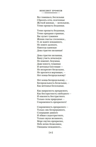 Всемирную славу Венедикту Ерофееву принесла его знаменитая, переведенная более чем на тридцать языков поэма «Москва — Петушки». И хотя ее герой — Веничка — так и не увидел Красной площади, зато стал поистине народным, а сам автор теперь уже признан классиком русской литературы ХХ века. Однако творческое наследие Ерофеева — это не только поэма «Москва — Петушки», это и «Записки психопата» (1956–1958), начатые в 17-летнем возрасте, и пьеса «Вальпургиева ночь» (часть задуманной автором, но неосуществленной трилогии под общим названием «Драй Нэхте»), и так называемые произведения малой прозы, включая сочинение, написанное на вступительных экзаменах в институт, и краткая автобиография.