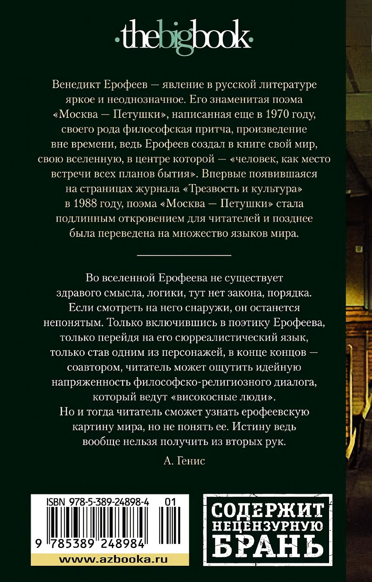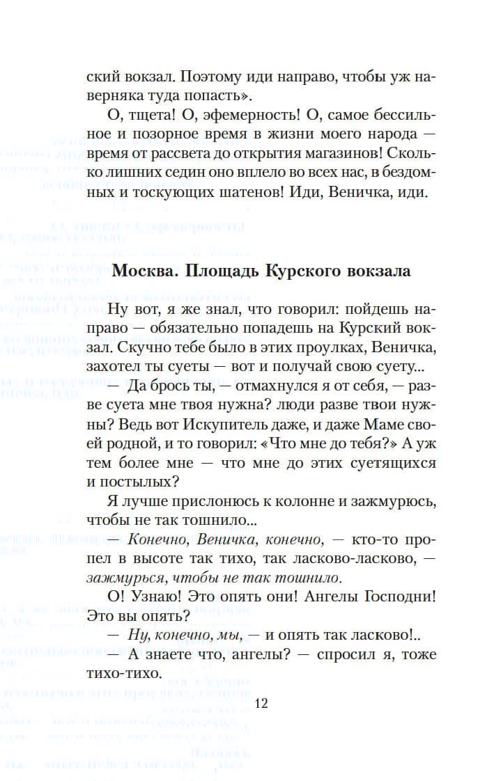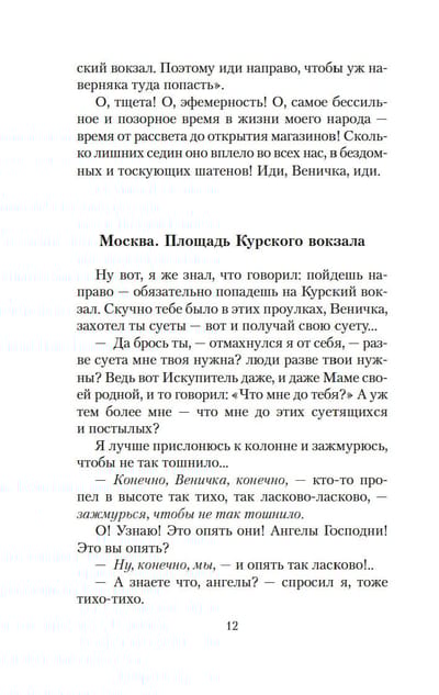 Венедикт Ерофеев — явление в русской литературе яркое и неоднозначное. Его знаменитая поэма «Москва — Петушки», написанная еще в 1970 году, своего рода философская притча, произведение вне времени, ведь Ерофеев создал в книге свой мир, свою вселенную, в центре которой — «человек, как место встречи всех планов бытия». Впервые появившаяся на страницах журнала «Трезвость и культура» в 1988 году, поэма «Москва — Петушки» стала подлинным откровением для читателей и позднее была переведена на множество языков мира.