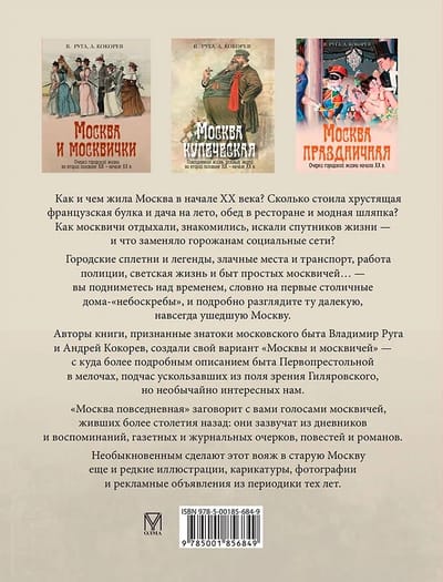Авторы книги, признанные знатоки московского быта Владимир Руга и Андрей Кокорев, создали свой вариант «Москвыи москвичей» — с куда более подробным описанием быта Первопрестольнойв мелочах, подчас ускользавших из поля зрения Гиляровского, но необычайно интересных нам. «Москва повседневная» заговорит с вами голосами москвичей, живших более столетия назад: они зазвучат из дневников и воспоминаний, газетных и журнальных очерков, повестей и романов.