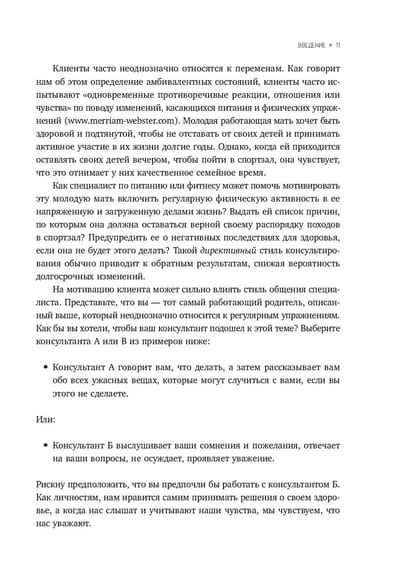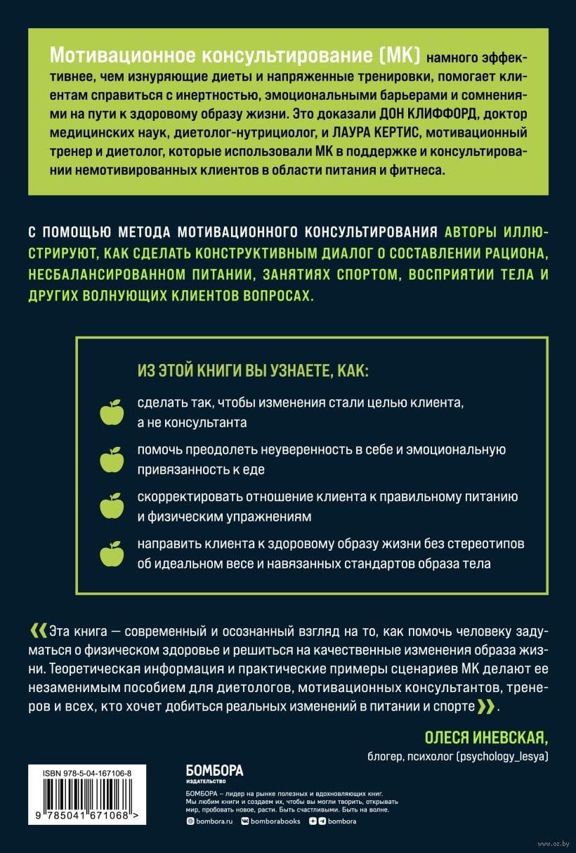 С помощью метода мотивационного консультирования авторы иллюстрируют, как сделать конструктивным диалог о составлении рациона, несбалансированном питании, занятиях спортом, восприятии тела и других волнующих клиентов вопросов. Информационные таблицы, схемы и разборы диалогов МК в области питания и фитнеса помогут вам направить мотивацию клиента в сторону качественных изменений образа жизни.