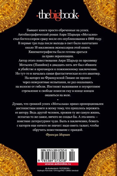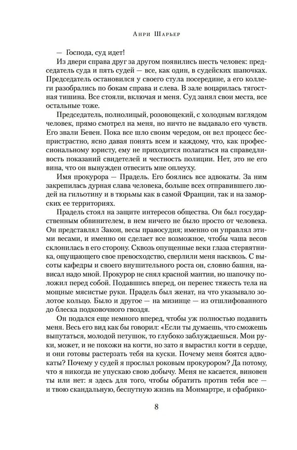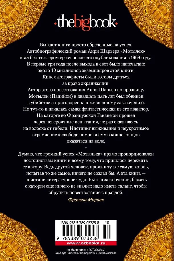 Автор этого повествования Анри Шарьер по прозвищу Мотылек (Папийон) в двадцать пять лет был обвинен в убийстве и приговорен к пожизненному заключению. Но тут-то и началась самая фантастическая из его авантюр. На каторге во Французской Гвиане он прошел через невероятные испытания, не раз оказываясь на волоске от гибели. Инстинкт выживания и неукротимое стремление к свободе помогли ему в конце концов оказаться на воле.