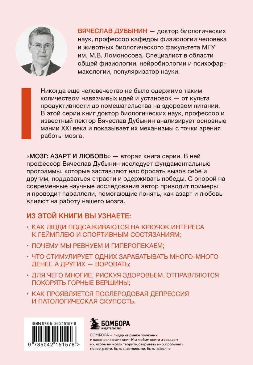 «Мозг: азарт и любовь» — вторая книга серии. В ней профессор Вячеслав Дубынин исследует фундаментальные программы, которые заставляют нас бросать вызов себе и другим, поддаваться страсти и одерживать победы. С опорой на современные научные исследования, автор приводит примеры и проводит параллели, помогающие понять, как азарт и любовь влияют на работу нашего мозга.