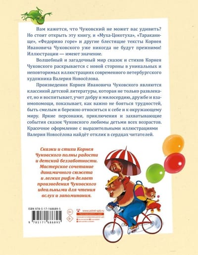 Произведения Корнея Ивановича Чуковского являются классикой детской литературы, которая не только развлекает, но и воспитывает, учит добру и милосердию, дружбе и взаимопомощи, показывает, как важно не бояться трудностей, быть смелым и бережно относиться к себе и к окружающему миру. Яркие персонажи, приключения и захватывающие события сказок Чуковского любимы детьми всех возрастов. Красочное оформление с выразительными иллюстрациями Валерия Новосёлова найдёт отклик в сердцах читателей.