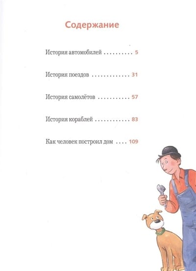 В этой книге шведский механик и мастер на все руки Мулле Мек и его верная помощница собака Буффа расскажут, откуда в современном мире появились автомобили, поезда, самолёты, корабли и высотные дома. Читатель узнает, где жили и на чём передвигались люди в старые времена; познакомится с находчивыми изобретателями и смелыми испытателями, благодаря которым человечество на протяжении столетий неуклонно двигалось вперёд по пути прогресса, а также сможет одним глазком заглянуть в будущее! Ранее все пять рассказов, вошедших в этот сборник, были изданы отдельными книгами: «История автомобилей», «История поездов», «История самолётов», «История кораблей», «Как человек построил дом» в серии «Рассказывает Мулле Мек».