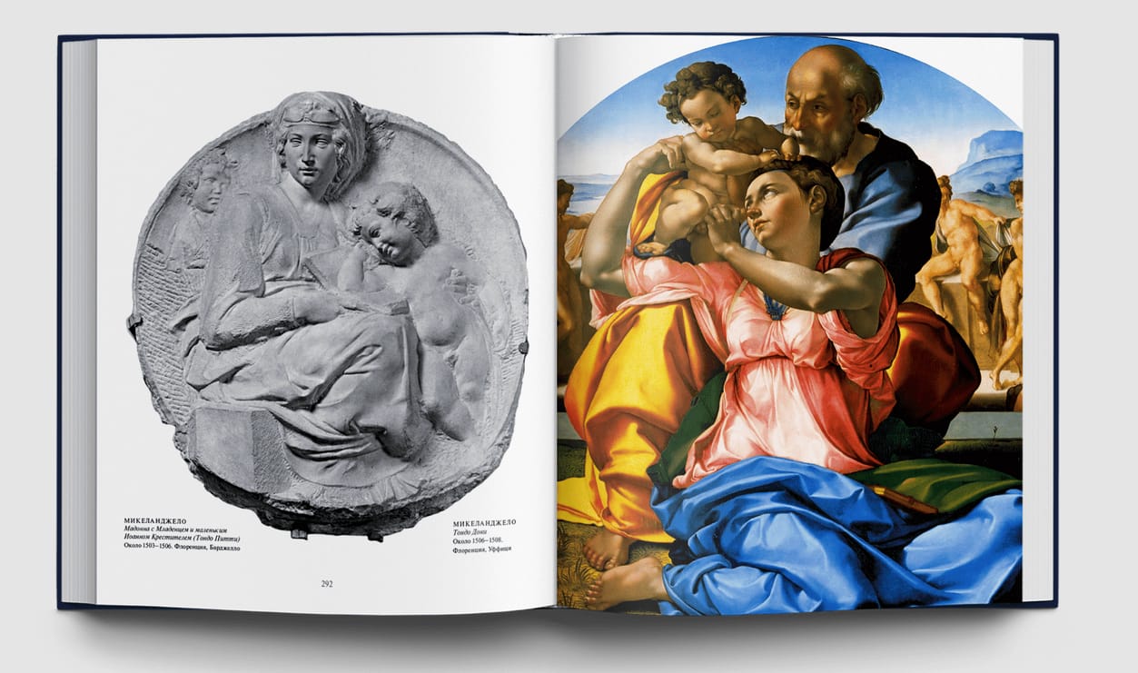 Альбом предлагает увлекательное путешествие в эпоху Ренессанса. В центре рассказа три гениальных мастера: Леонардо, Рафаэль и Микеланджело. Но начинается рассказ с периода, находящегося на стыке «осени Средневековья» и «весны Возрождения», что дает возможность почувствовать художественную атмосферу, подготовившую появление этих гигантов, и познакомиться с произведениями их предшественников: Мазаччо, Донателло, Мантеньи, мастеров венецианской школы. Читатель получит уникальную возможность увидеть репродукции произведений, хранящихся не только в знаменитых музеях, но и в собраниях, менее известных широкой публике.