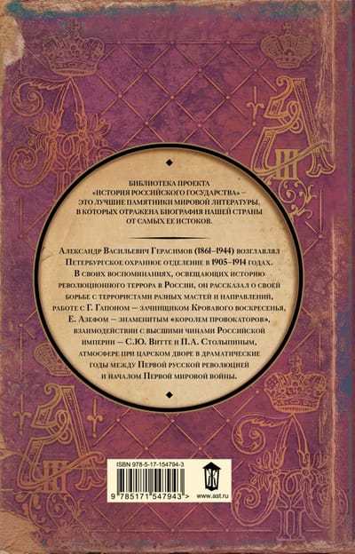 Библиотека проекта «История Российского государства» — это рекомендованные Борисом Акуниным лучшие памятники мировой литературы, в которых отражена биография нашей страны от самых ее истоков. Александр Васильевич Герасимов (1861–1944) возглавлял Петербургское охранное отделение в 1905–1914 годах. В своих воспоминаниях, освещающих историю революционного террора в России, он рассказал о своей борьбе с террористами разных мастей и направлений, работе с Г. Гапоном — зачинщиком Кровавого воскресенья, Е. Азефом — знаменитым «королем провокаторов», взаимодействии с высшими чинами Российской империи — С.Ю. Витте и П.А. Столыпиным, атмосфере при царском дворе в драматические годы между Первой русской революцией и началом Первой мировой войны.