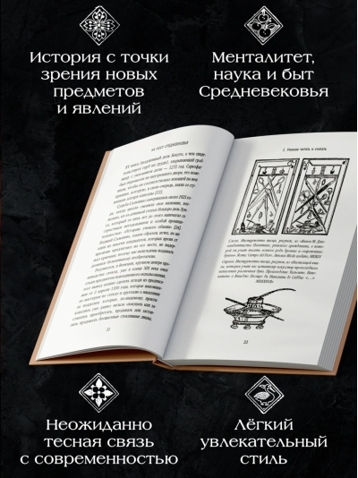 Средние века считались некогда темными веками — время интеллектуального застоя и жестоких нравов. В действительности это было время необычайных культурных новшеств и технологических инноваций. Выдающийся историк-медиевист Кьяра Фругони приглашает нас в удивительное путешествие по дорогам Средневековья, ко всем тем вещам и идеям, которые появились в эту эпоху и имеют важнейшее значение для нас сегодня. Благодаря Средним векам мы приобрели очки, книги, брюки, карты Таро, мельницы и обеденные столы, а у нашего домашнего очага появилась кошка. Само время оказалось покорено и заключено в облик часов на спусковом механизме.