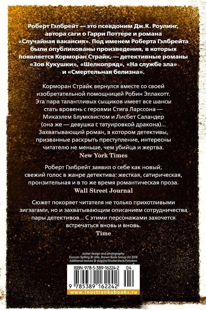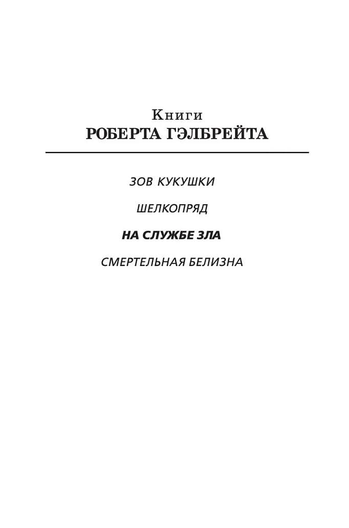 Робин Эллакотт получает с курьером таинственный пакет — в котором обнаруживается отрезанная женская нога.   Ее начальник, частный детектив Корморан Страйк, не так удивлен, но встревожен не меньше. В его прошлом есть четыре возможных кандидатуры на личность отправителя — и каждый из четверых способен на немыслимую жестокость.   Полиция сосредоточивает усилия на поиске одного из этих четверых, но Страйк чем дальше, тем больше уверен, что именно этот подозреваемый ни при чем. Вдвоем с Робин они вынуждены взять дело в свои руки и погрузиться в пучины исковерканной психики остальных троих подозреваемых. Но таинственный убийца наносит новые удары, и Страйк с Робин понимают, что их время на исходе...   "На службе зла" — дьявольски увлекательный роман-загадка со множеством неожиданных сюжетных поворотов, а также — история мужчины и женщины, пребывающих на перепутье как в профессиональном плане, так и в том, что касается личных отношений.