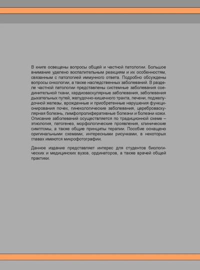 В удобном формате с обилием интересных запоминающихся иллюстраций представлена ключевая информация по эпидемиологии, патогенезу, клиническим симптомам большинства заболеваний. Уделено большое внимание воспалительным реакциям, их особенностям, связанным с патологией иммунного процесса. Содержание книги разбито на три секции: основы патологии, системная патология и примеры клинических случаев. Включен материал для самопроверки.