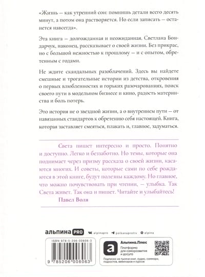 Откровенная и ироничная исповедь Светланы Бондарчук. Это не мемуары в классическом смысле, а собрание жизненных историй, наблюдений и уроков. Книга о том, как не бояться перемен, принимать ошибки и находить себя после всего. Без сожалений и обид. С самоиронией, благодарностью и светом. Светлана пишет о детстве, семье, любви, дружбе, разводе, взрослении и силе честности. Это рассказ женщины, которая познала боль и сохранила главное: достоинство, чувство юмора и здравый взгляд на жизнь.
