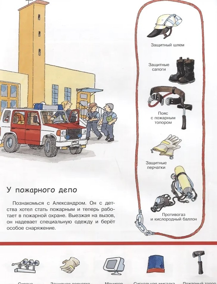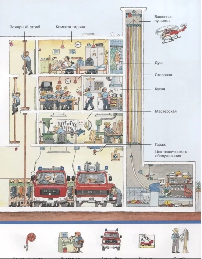 На каждом книжном развороте внимание Вашего малыша привлекут красочные сюжетные изображения различных жизненных ситуаций, связанных с работой пожарной службы. Это и показанные в разрезе все необходимые подразделения пожарной части и её диспетчерского центра, последовательность действий сотрудников пожарной охраны при вызове на тушение пожара или в случае другой экстремальной ситуации, разнообразные виды специальной пожарной техники и особого пожарного снаряжения.