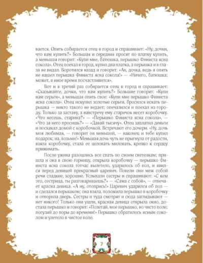 В книгу вошли сказки на самые популярные и интересные, порой шуточные, а порой таинственные и страшные сюжеты: о падчерице и злой мачехе («Морозко», «Василиса Прекрасная», «Чернушка», «Крошечка-хаврошечка»), о чудесной жене («Царевна-лягушка», «Поди туда — не знаю куда, принеси то — не знаю что») и чудесном муже («Перышко Финиста Ясна Сокола»), о плутовке-лисе, волке и козе, петушке, журавле и цапле и многие другие, раскрывающие разнообразие их вариантов и деталей, отражающих живое бытование текстов в различных регионах и индивидуальность сказочника.